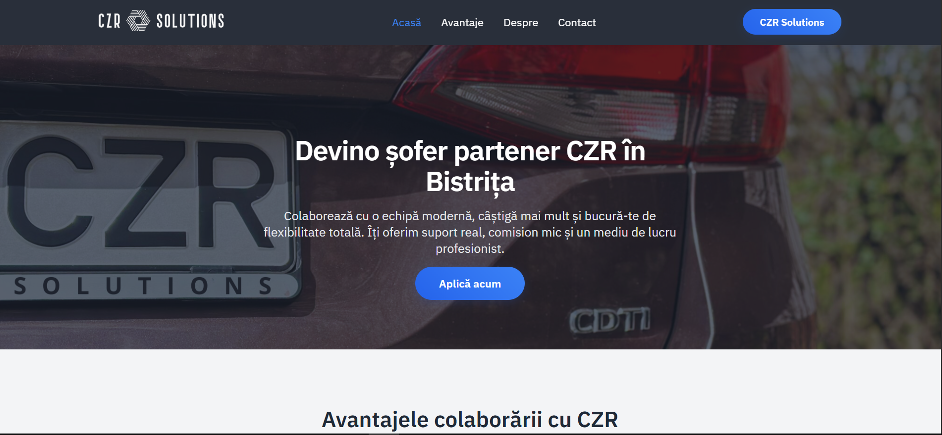 Platformă de recrutare pentru șoferi parteneri Bolt în Bistrița, dezvoltată pentru afiliatul CZR Solutions. Include landing page modern cu prezentarea avantajelor colaborării, formular de aplicare, secțiuni informative și design responsive optimizat pentru conversie.