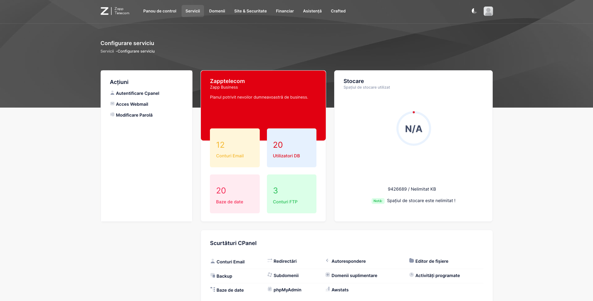 Panou de control complet pentru utilizatorii Zappnet, dezvoltat pentru gestionarea serviciilor de hosting, facturi, plăți, tickete de suport și integrare cu cPanel API. Include dashboard interactiv, grafice, gestionare conturi și integrare PayPal.